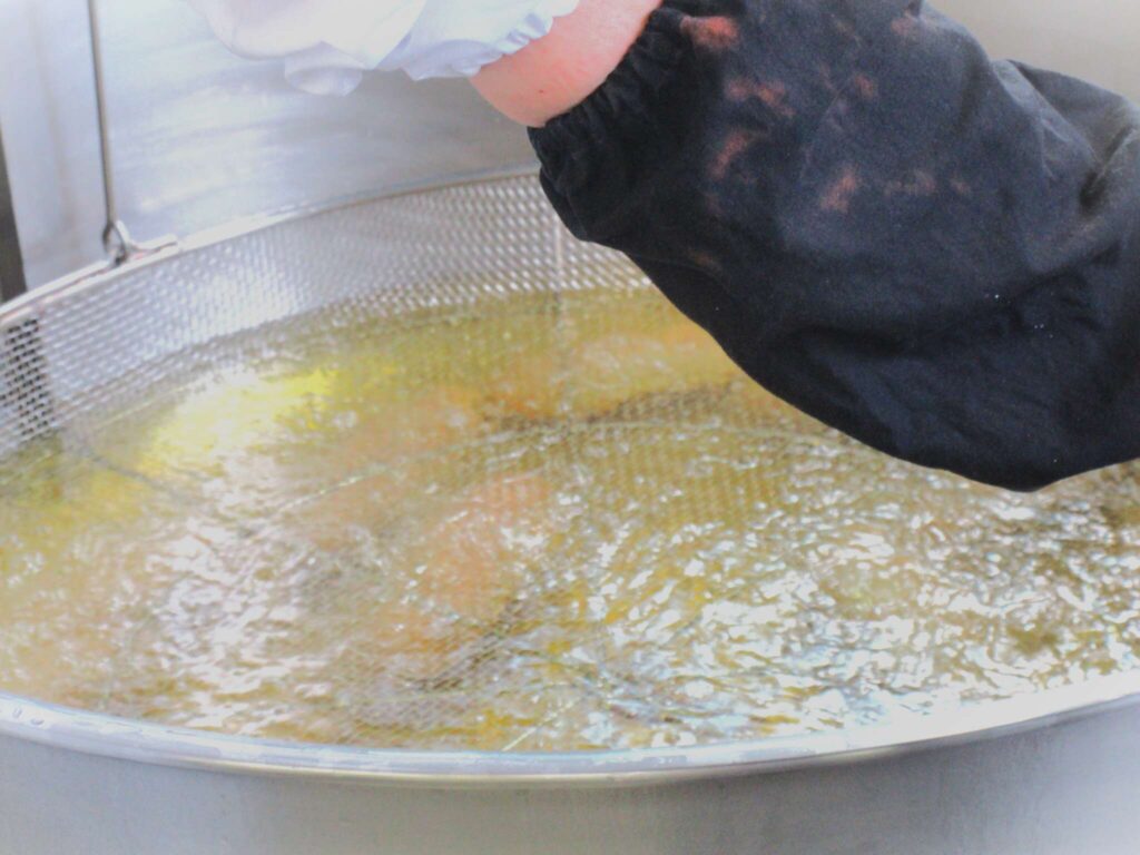 たらのごまみそあえは、角切りのたらを揚げるところからスタート!