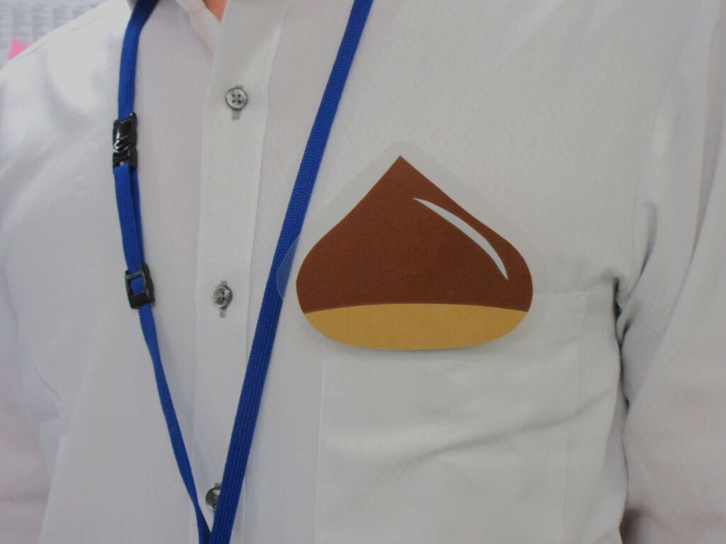 胸にきらりと光る栗を携えて、無言のプロモーション スタートだ!