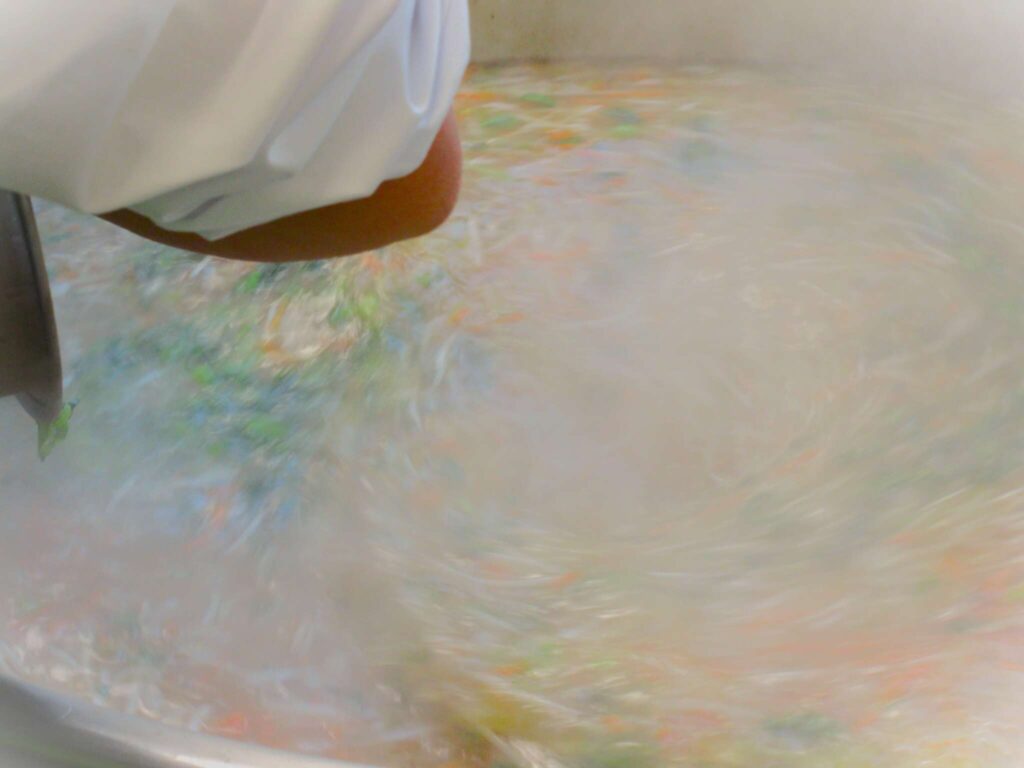 すべての具材と調味料が入り、グルグル混ざるスープ!