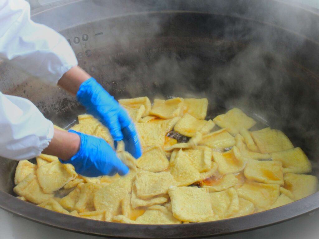 大きくカットした油揚げを、甘めのタレで煮込んでいく!!