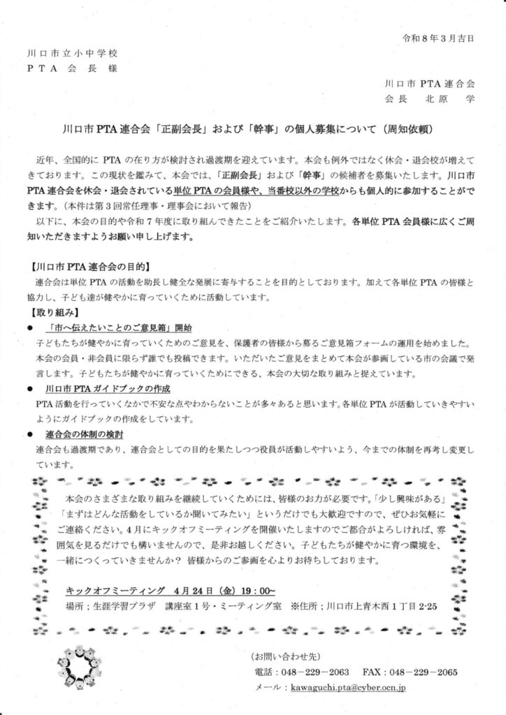 川口市PTA連合会から表題の件について周知依頼がありましたのでお知らせいたします。
