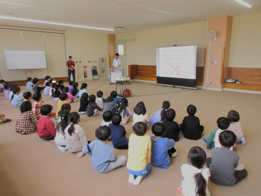 まずは給食について、栄養教諭の話を聞いて心の準備をしていきます!